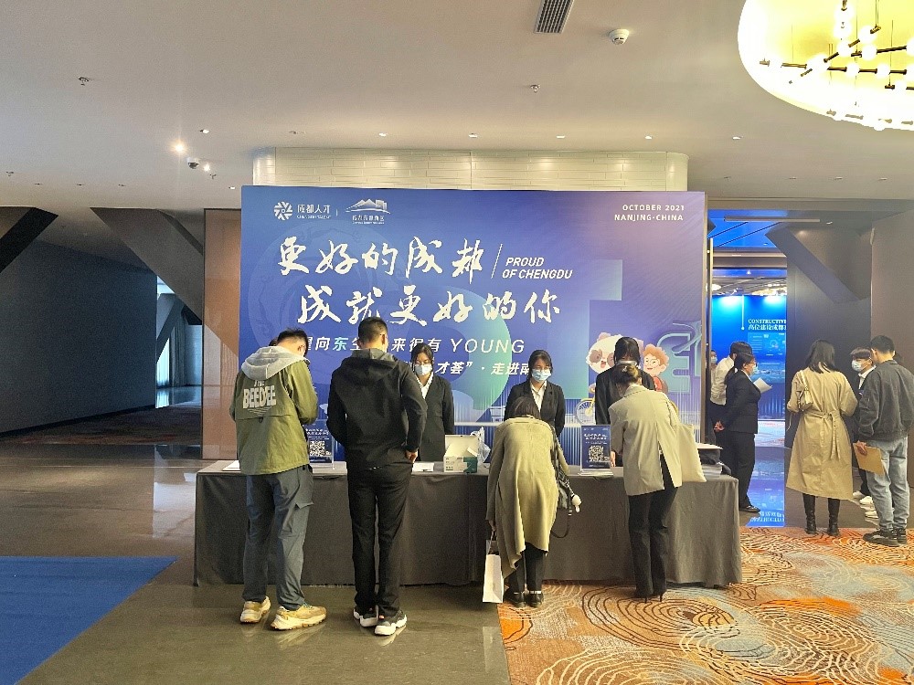 2021年10月30日,av影片直播 人力资源办公室主任张艳阳、副主任夏旭赴南京参加由成都东部新区举行的“蓉耀向东生 未来很有YOUNG”推介招聘会。