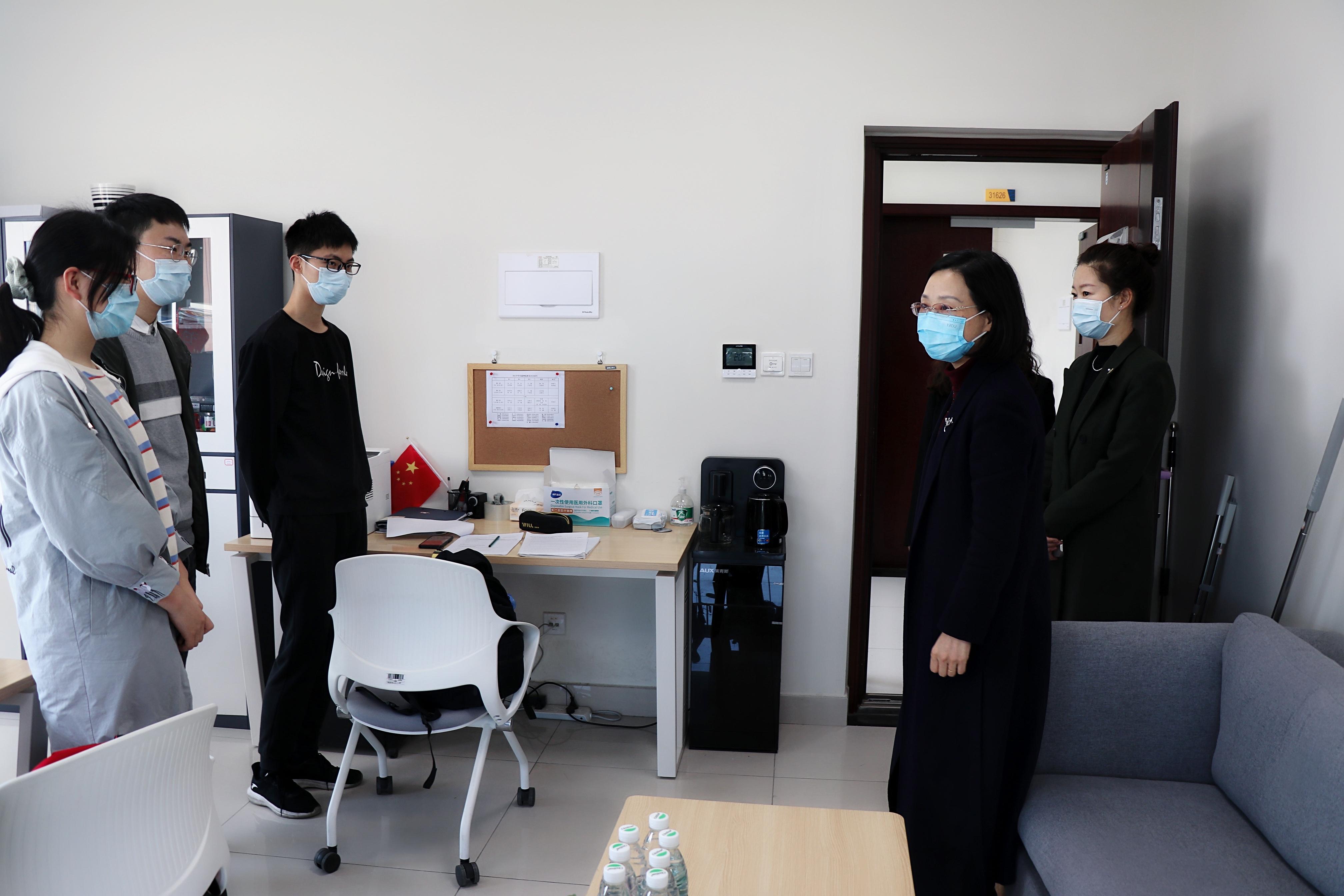 学生主题文化墙、党建活动室等区域,并走进学生管理办公室与辅导员和同学们亲切交流。