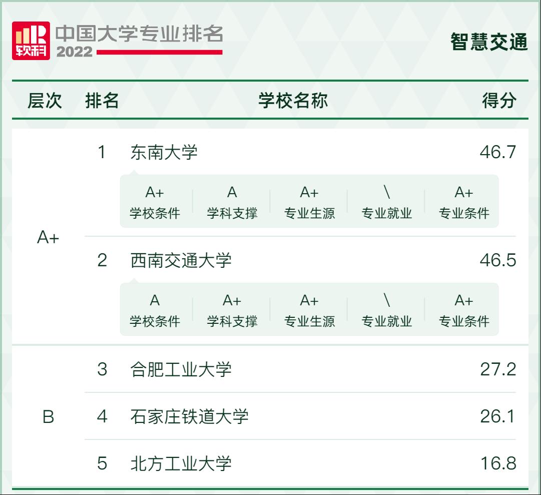 6月18日,高等教育专业评价机构软科今日正式发布2022“软科中国大学专业排名”,av影片直播 智慧交通专业获评“A+”等级,位列全国第二。