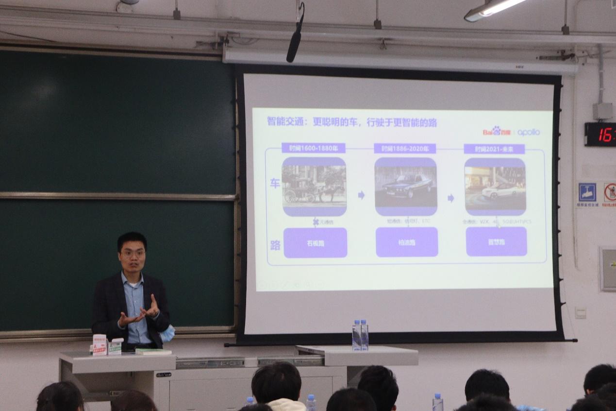 邀请百度Apollo在X2226为专业学生开展宣讲。百度智能驾驶人才生态总监刘锡乾,百度智能驾驶高级架构师季清爽,百度智行科技何议芳、候明涛、赵倩、严艳林、李兴斌通过线上线下结合的方式出席活动,智慧交通专业全体学生参会。