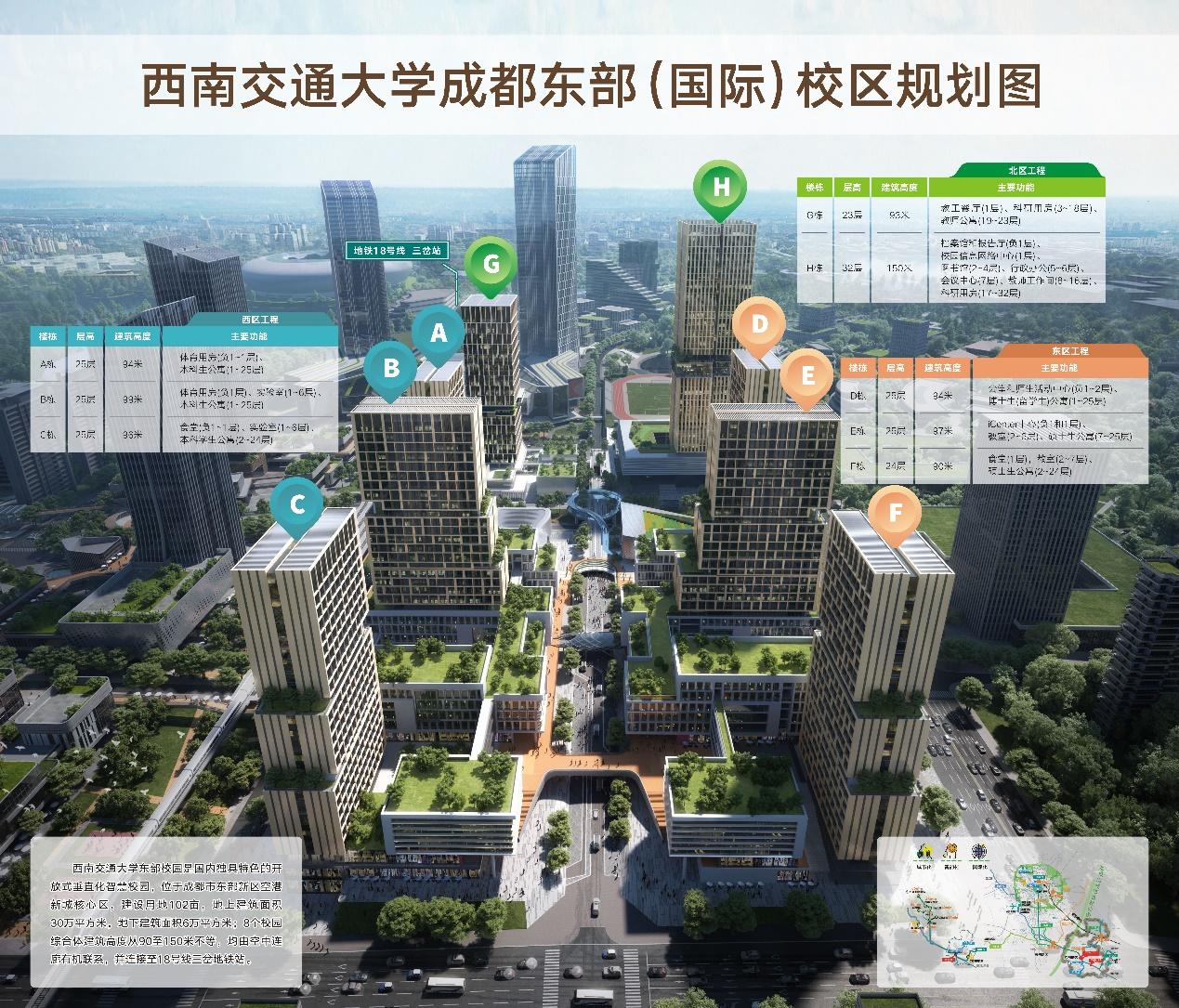 成都东部(国际)校区建设按照西区、东区、北区三个区域分期建设,本次全面封顶的一期(西区)工程建设净用地面积约2.41万平方米,总建筑面积约11.93万平方米,地下建筑面积约1.66万平方米,含3个校园综合体,地上最高25层、地下1层,主要功能为基础实验、运动场馆、学生公寓、学生食堂等功能用房。二期(东区)工程于2021年11月3日开工,主要功能为公共教学、创新中心、学生会堂、学生公寓。三期(北区)工程于2022年7月12日开工,主要功能为图书馆、信息中心科研、行政及教师办公用房,科研平台和教师周转公寓。全面建成之后,三个区域8个校园综合体之间将构建空中步道,通过集约高效的功能布局、立体复合的空间形态、绿色生态的城市景观,打造 “立体分层+无边界”的校城融合型校园和交大智慧创新谷。