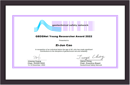 曹子君教授获得国际岩土工程安全学会颁发的青年科学家奖(GEOSNet Young Researcher Award)。该奖项表彰词为: