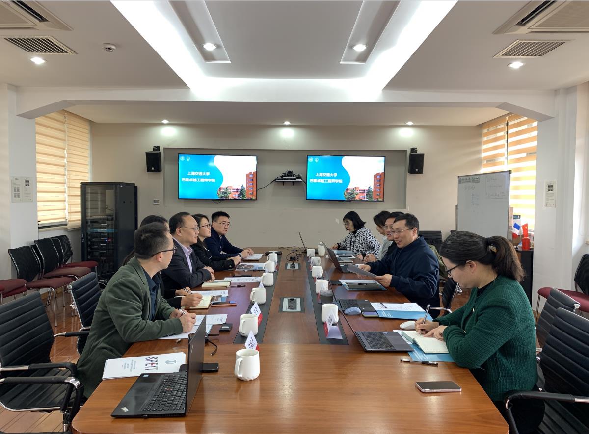 中方院长、党总支书记张文明,副院长陆佳亮,院长助理章丽辉等相关负责人与调研团座谈,从不同角度向团队介绍了引进、融合法国工程师培养理念和优质资源与上海交通大学强强联合开展合作办学的模式、特色、成效等。