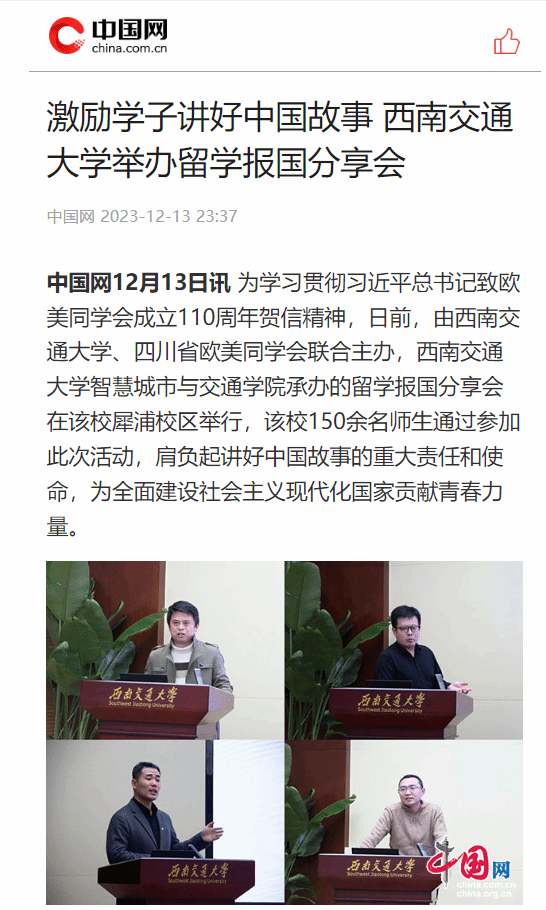 “我们希望自己能为加快解决科技领域‘卡脖子’难题做出自己的贡献!” 四川省欧美同学会成员、电子科技大学博士后崔凡以“攻坚克难,留学报国,解决技术难题,勇攀科技高峰”为主题,介绍了自己留学英国并学成归来、推动我国半导体领域技术和产业发展的经历,并勉励同学们在留学过程中主动吸纳融汇国外技术、制度、思想、文化,不断促进自身成长,回国后努力为提升我国科技创新能力、推动解决高质量发展卡点瓶颈贡献海归青年力量。