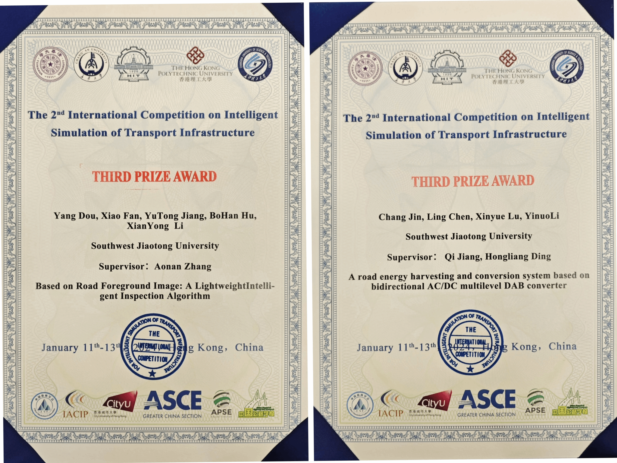 本科生参赛队伍,在大部分参赛队伍都是博士生组成的情况下,经过多轮匿名评审入围决赛并获奖实属不易,同时勉励队伍成员深耕研究领域,再接再厉,在第三届国际交通基础设施智能仿真大赛中取得更好成绩。