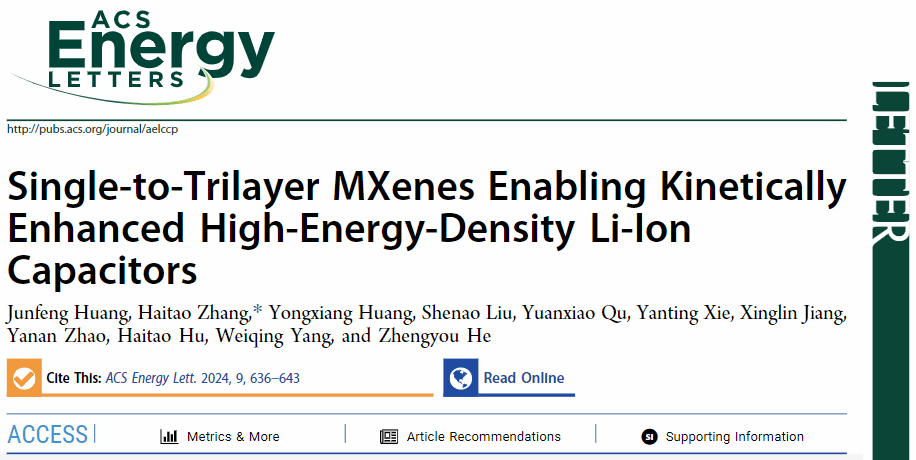 Junfeng Huang, Haitao Zhang*, Yongxiang Huang, Shenao Liu, Yuanxiao Qu, Yanting Xie, Xinglin Jiang, Yanan Zhao, Haitao Hu, Weiqing Yang, Zhengyou He. Single-to-trilayer MXenes enabling kinetically enhanced high-energy-density Li-ion capacitors. ACS Energy Lett., 2024, 9, 636-643