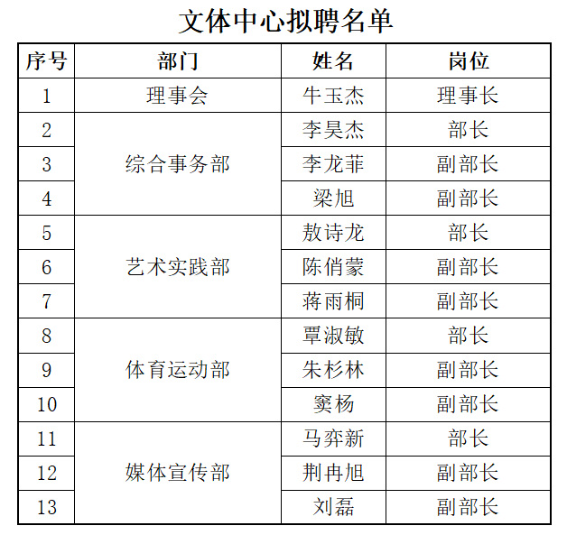 学生文体活动中心选聘工作小组本着“公开、公平、公正”的原则,面向全院学生选聘文体中心理事长及各部门部长、副部长。经个人申请、资格审查、现场面试等环节,最终拟聘任以下同学担任2022-2023学年av影片直播