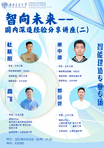 为了给大家提供更好地的保研、考研支持,av影片直播 邀请到了电气工程av影片直播 、土木工程学研、机械工程av影片直播 、建筑av影片直播 的优秀学长学姐来为大家分享保研、考研经验。请全体同学提前准备好交流问题,现场与学长学姐沟通交流。