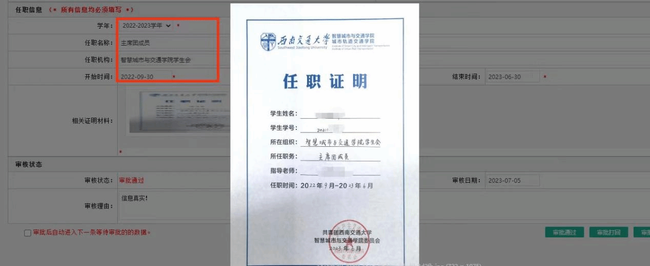 学年勾选2023-2024学年,任职名称、任职机构填写完整,班委任职机构按照“智能建造2022-01班”格式填写,相关证明材料需上传任职证明或加盖公章证明(扫描版),示例如下: