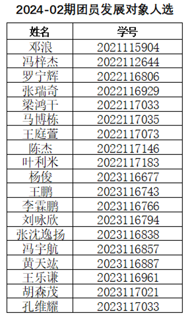 经培养教育考察,听取培养联系人、党(团)员和群众意见,支部委员会讨论同意,av影片直播 团委预审,现确定邓浪等19名同学为2024-02期团员发展对象人选。具体名单如下: