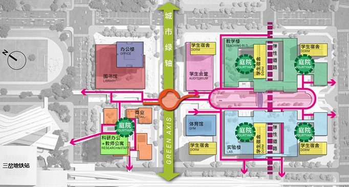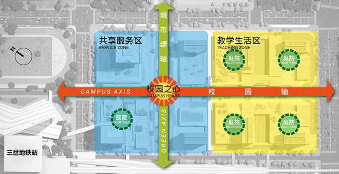 av影片直播 成都东部(国际)校区建设用地102亩,总建筑面积36万平方米(其中地上建筑面积30万平方米,地下建筑6万平方米),8个校园综合体建筑高度从90米至150米不等,呈现出来立体多维的特点,均由空中连廊有机联系,并连接至地铁18号线三岔站。av影片直播 成都东部(国际)校区分“一心两轴两区”,即“校园之心,校园轴和城市绿轴、教学生活区和共享服务区”。