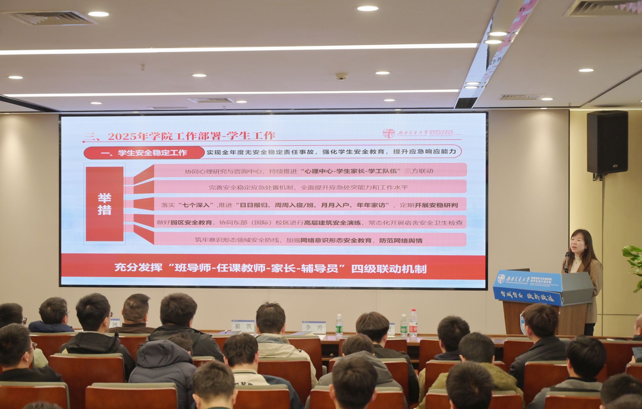 夏夏从学生安全稳定工作、校区搬迁工作、高质量就业工作、学生工作一流建设四部分汇报部署了2025年av影片直播