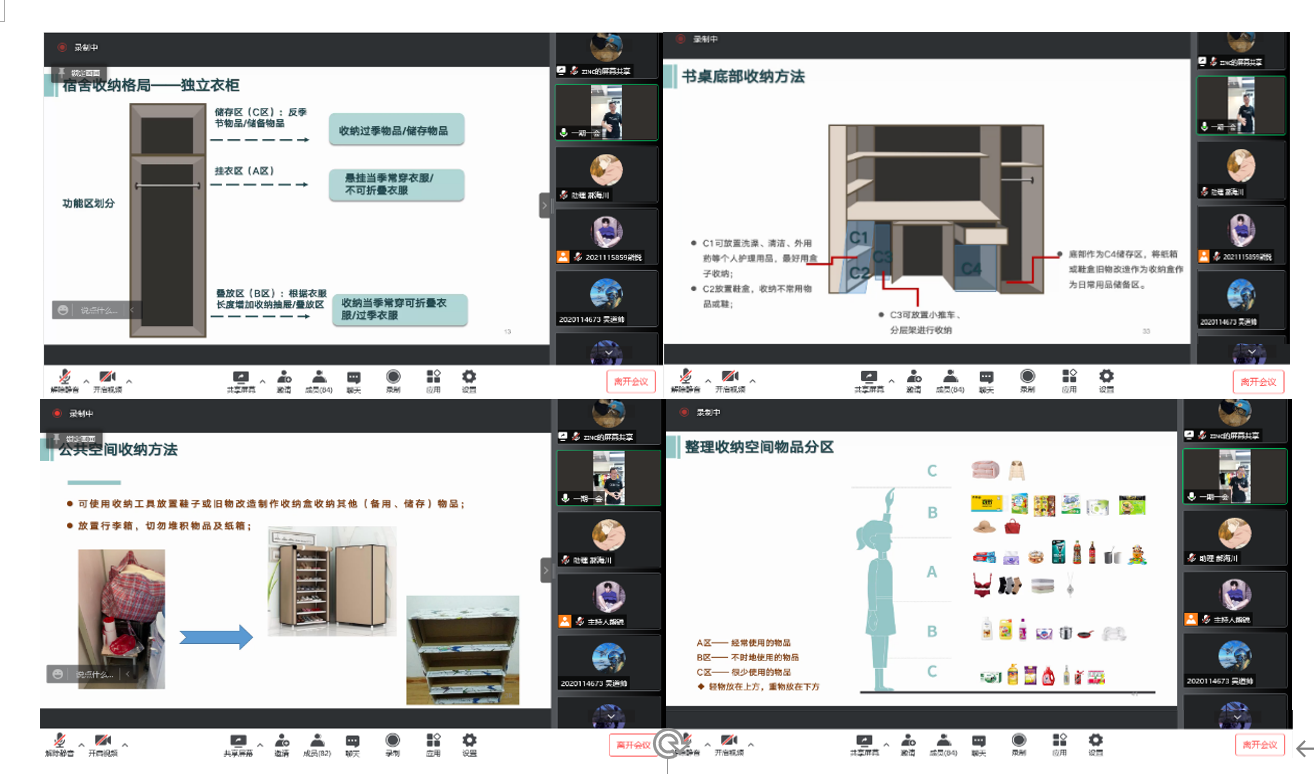 学生宿舍的空间特点,以饱含艺术性、科学性及技术性的实景互动形式为同学们讲解了断舍离的真实含义,展示了人与环境的相互融合关系以及如何合理进行宿舍空间规划。