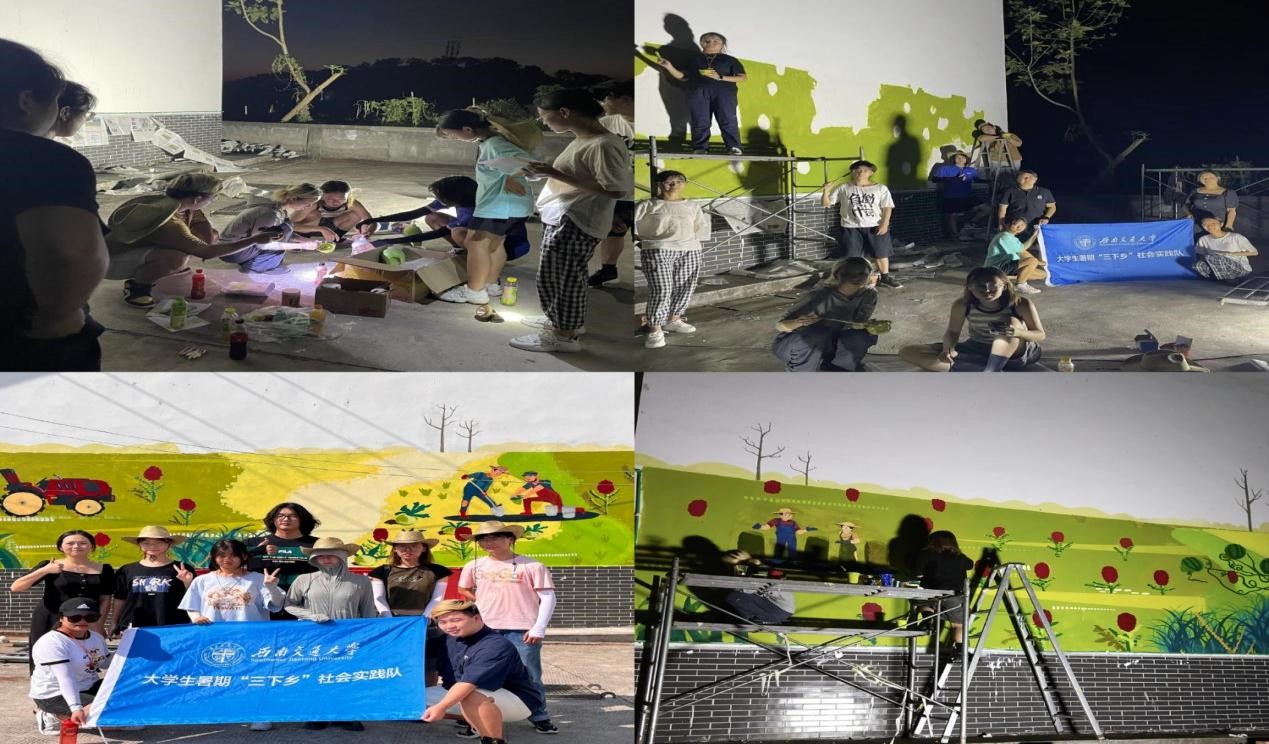 赴自贡市沿滩区“共绘乡村”主题实践队来到自贡沿滩九洪乡三河村,开展了“美丽乡村·绘梦青春”主题实践活动。实践队队员规划墙绘规模、克服艰苦条件、早晚开展工作,将做贡献的决心转化为实际行动。实践队队员借助专业所长,助力乡村振兴,美化乡村环境,以绘画之美,发青春之光,最终得到了村民们和沿滩区团委的高度肯定。