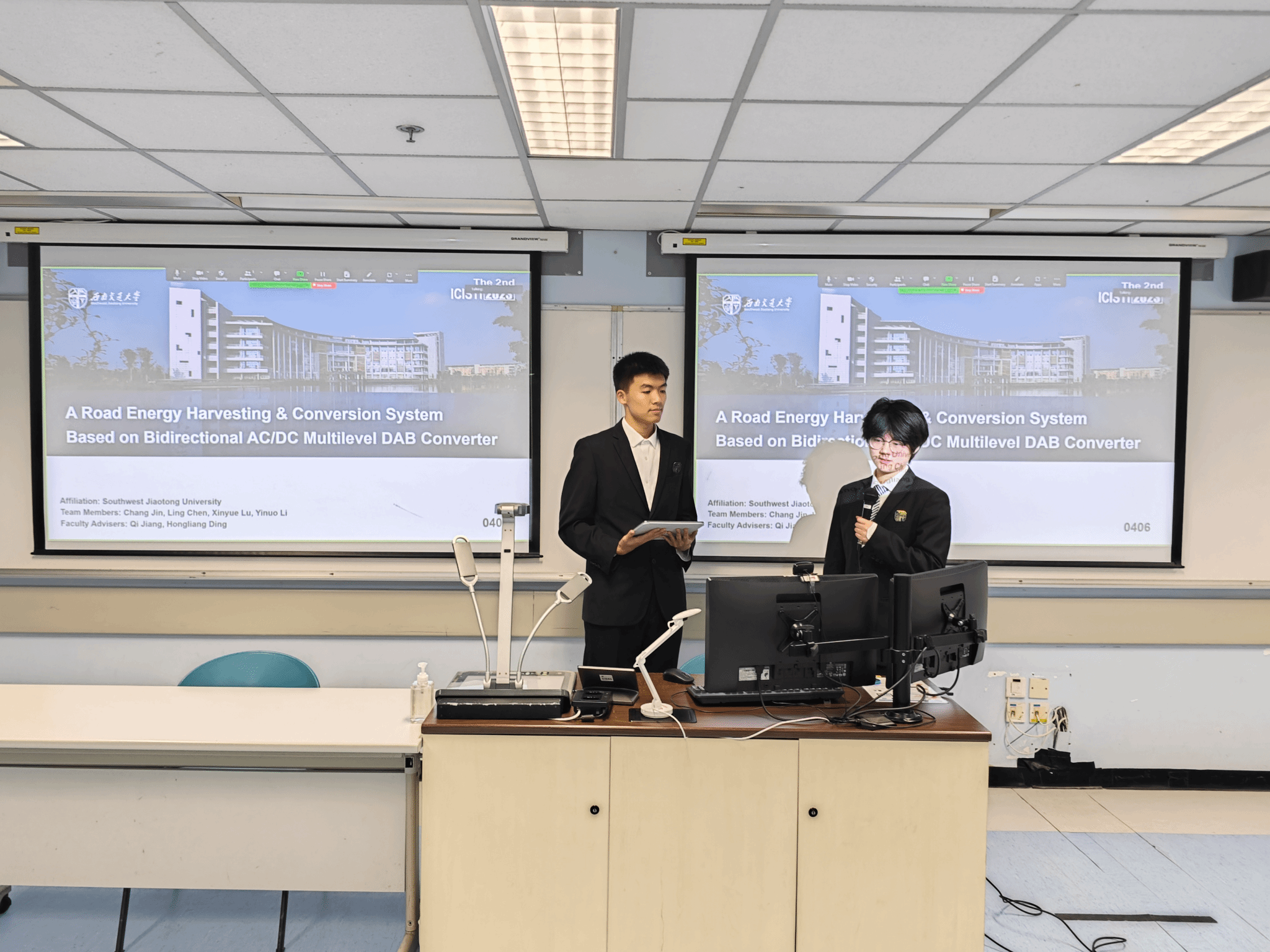参赛队伍分别以Based on Road Foreground Image: A Lightweight lntelligent Inspection Algorithm(基于道路前景图像的轻量化智能巡检算法)和A road energy harvesting and conversionsystem based on bidirectional AC/DCmultilevel DAB converter(基于双向AC/DC多电平DAB转换器的道路能量收集与转换系统)为题,全程使用英文陈述和探讨了利用人工智能深度学习技术来精准、快速掌握道路交通资产、路面病害的状况及相关统计数据和“道路能量”的收集储存及直流电与交流电高效率转换问题,并根据评委现场提问进行答辩。