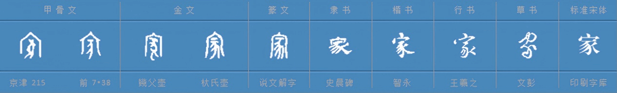 家,现代汉语常用字、 一级字,读作jiā,最早见于甲骨文,其本意是屋内、住所。《史记·乐毅列传》:“乐羊死,葬于灵寿,其后子孙因家焉。”引申为安家落户、定居,家还可引申为自己家庭的住房、室内及机关部队等单位的住地等意。
