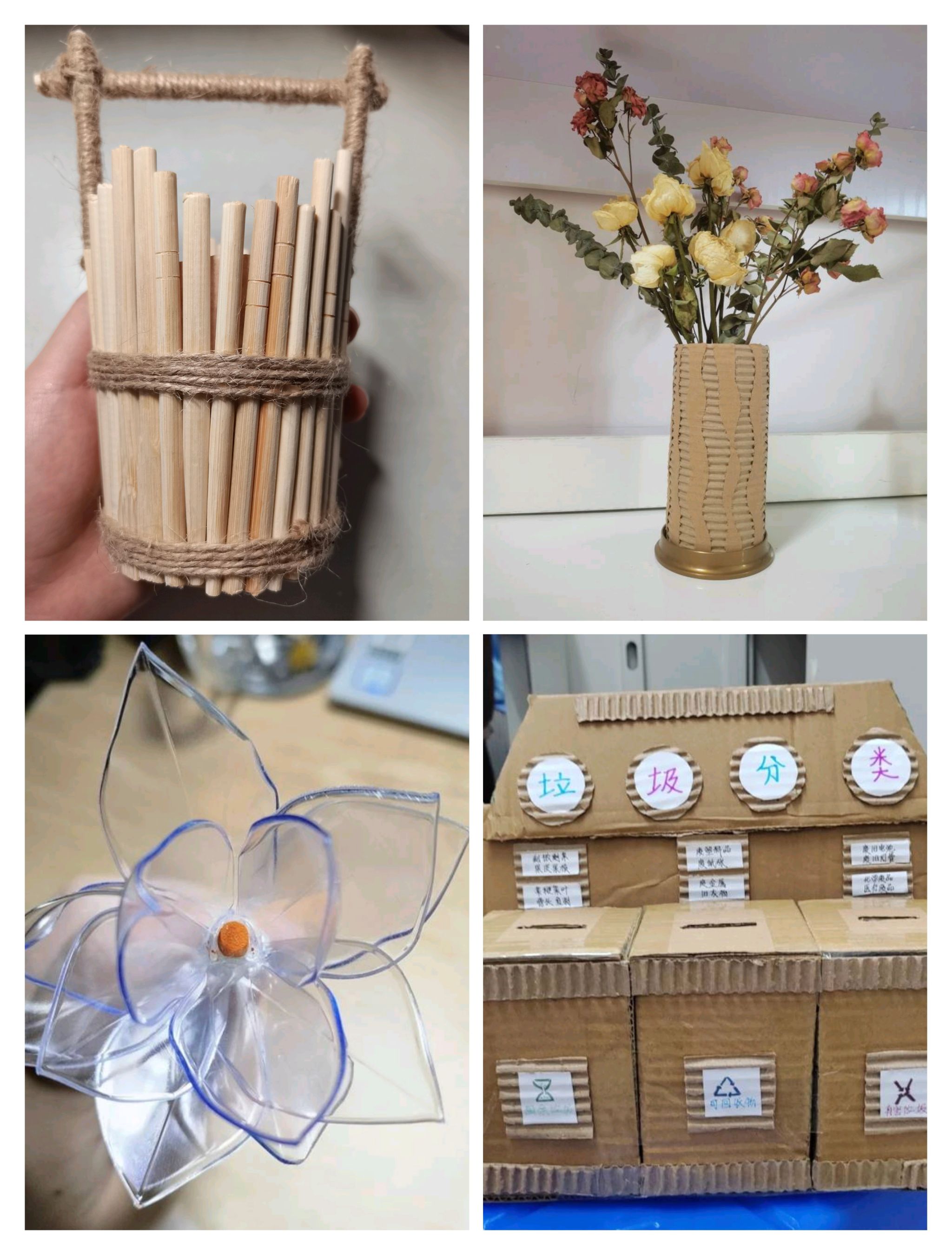 与此同时,5月9日,“小设计·大智慧”废品改造活动线上线下同步举行。参与学生利用闲置的废品进行设计改造,将废弃的纸壳、手机壳、塑料等物品变成了精美的收纳盒、花瓶等实用物品,实现了废弃物品的循环和二次利用。这一活动不仅激发了学生的创造力,还增强了他们的环保意识。