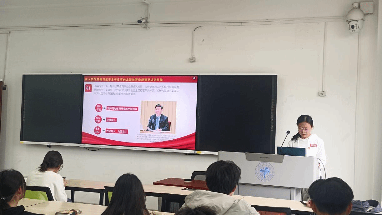 随后,赵施一佳同志对习近平总书记重要文章《扎实推动教育强国建设》进行了解读。党支部成员周亦璟、朱俊博、泮蒙业同志进行了学习感悟分享,结合专业知识对青年力量在强国之路上能作出什么贡献进行了研讨。