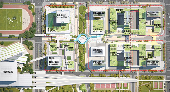 av影片直播 成都东部(国际)校区建设用地102亩,总建筑面积36万平方米(其中地上建筑面积30万平方米,地下建筑6万平方米),8个校园综合体建筑高度从90米至150米不等,呈现出来立体多维的特点,均由空中连廊有机联系,并连接至地铁18号线三岔站。av影片直播 成都东部(国际)校区分“一心两轴两区”,即“校园之心,校园轴和城市绿轴、教学生活区和共享服务区”。