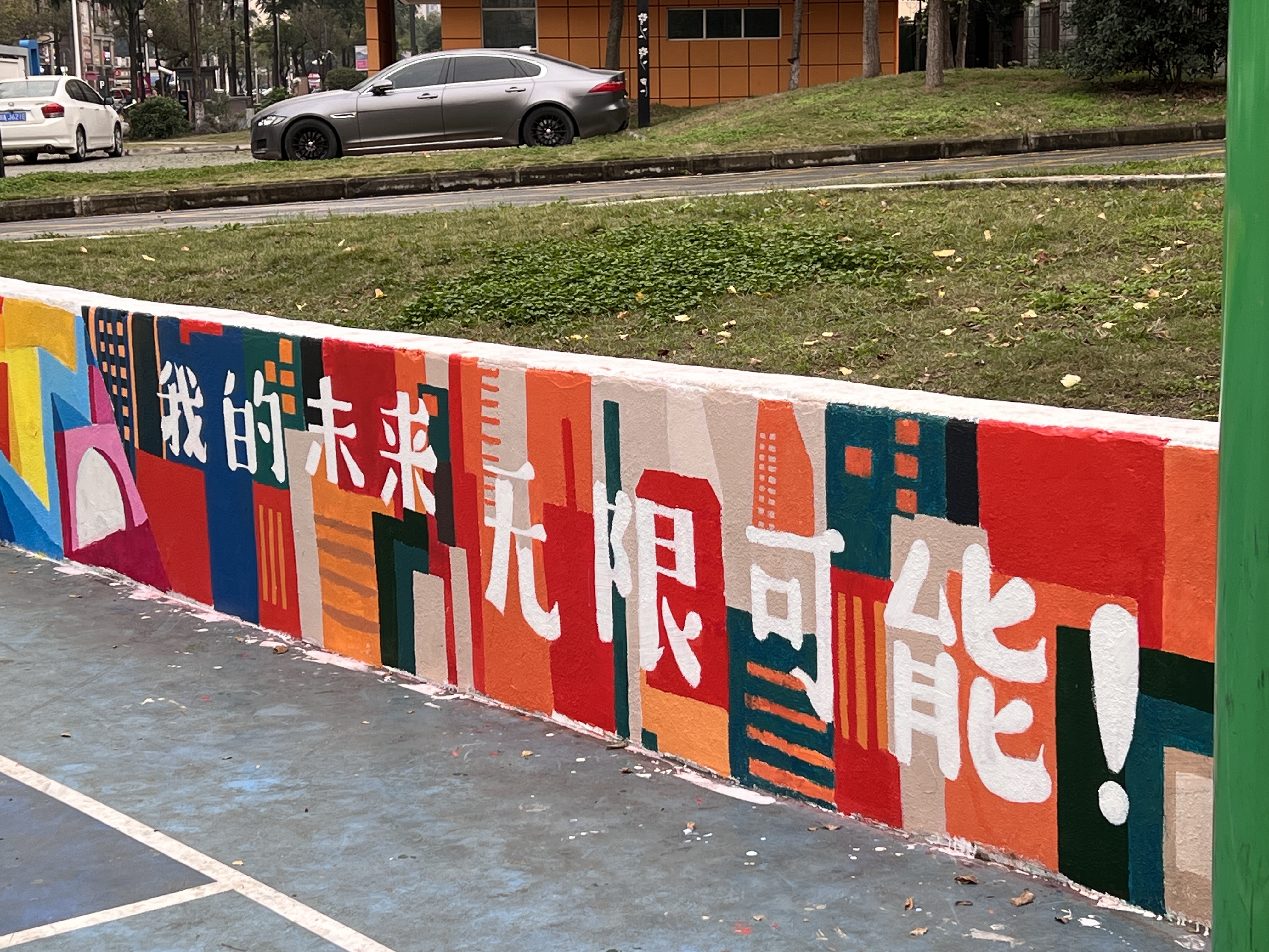 在前期准备时,同学们结合专业知识,融合童年元素,共同完成墙绘图案设计工作。