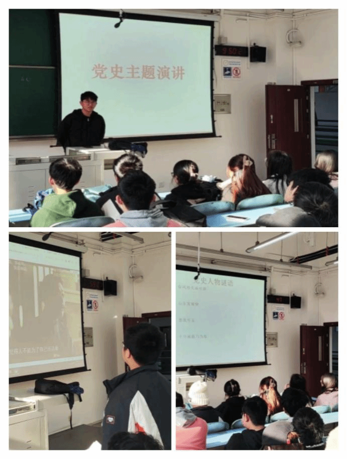 赓续红色血脉,熔铸精神之源。团支书采取了猜谜语、主题演讲、红色配音等丰富多彩的方式,带领同学们回顾党史。在猜谜语环节巧妙地将党的历史和相关知识融入其中,让同学们在思考中重温了那段光辉历程;在主题演讲环节,同学们深情讲述了革命先烈的英勇事迹,让大家更加珍惜当下的幸福生活;在红色配音环节,同学们身临其境地感受到了那段历史的真实,在聆听中感受到了那段历史的厚重和伟大。